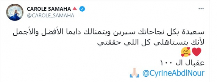 وكتبت كارول سماحة تغريدة، عبر حسابها الرسمي بموقع "تويتر": "سعيدة بكل نجاحاتك سيرين وبتمنالك دايما الأفضل والأجمل لأنك بتستاهلي كل اللي حققتيه، عقبال الـ100".