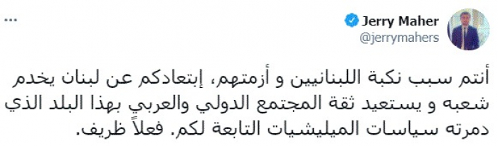 وجه الكاتب الصحفي اللبناني جيري ماهر، اليوم، انتقادًا لاذعًا لوزير الخارجية الإيراني محمد جواد ظريف، مؤكدًا أن إيران سبب نكبة اللبنانيين وأزمتهم.