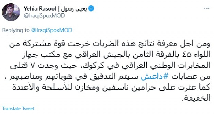 وأضاف: "ومن أجل معرفة نتائج هذه الضربات خرجت قوة مشتركة من اللواء ٤٥ بالفرقة الثامن بالجيش العراقي مع مكتب جهاز المخابرات الوطني العراقي في كركوك، حيث وجدت ٧ قتلى من عصابات داعش سيتم التدقيق في هوياتهم ومناصبهم ، كما عثرت على حزامين ناسفين ومخازن للأسلحة والأعتدة الخفيفة".