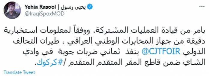 وقال في تغريدة عبر "تويتر" رصدها "المشهد العربي": " بأمر من قيادة العمليات المشتركة، ووفقاً لمعلومات استخبارية دقيقة من جهاز المخابرات الوطني العراقي، طيران التحالف الدولي ينفذ ثماني ضربات جوية في وادي الشاي ضمن قاطع المقر المتقدم المتقدم كركوك".