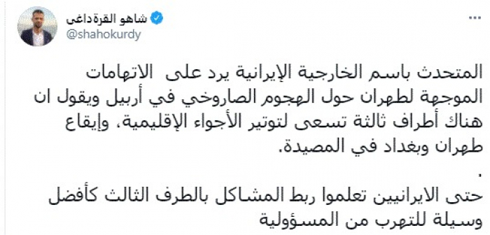 وقال في تغريدة عبر "تويتر" رصدها "المشهد العربي": "المتحدث باسم الخارجية الإيرانية يرد على الاتهامات الموجهة لطهران حول الهجوم الصاروخي في أربيل ويقول أن هناك أطراف ثالثة تسعى لتوتير الأجواء الإقليمية، وإيقاع طهران وبغداد في المصيدة".