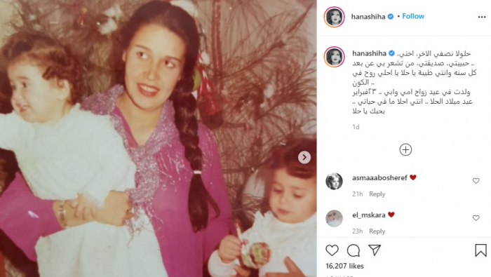 وأضافت: "كل سنة وإنتِ طيبة يا حلا يا أحلى روح في الكون.. ولدت في عيد زواج أمي وأبي.. ٢٣ فبراير عيد ميلاد الحلا.. أنتِ أحلا ما في حياتي.. بحبك يا حلا".