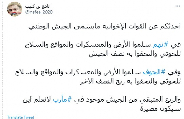 وقال في تغريدة عبر "تويتر" رصدها "المشهد العربي": "أحدثكم عن القوات الإخوانية ما يسمى الجيش الوطني في نهم سلموا الأرض والمعسكرات والمواقع والسلاح للحوثي والتحقوا به نصف الجيش".