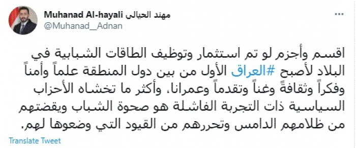 وقال في تغريدة عبر "تويتر" رصدها "المشهد العربي": "أقسم وأجزم لو تم استثمار وتوظيف الطاقات الشبابية في البلاد لأصبح العراق الأول من بين دول المنطقة علماً وأمناً وفكراً وثقافةً وغناً وتقدماً وعمرانا، وأكثر ما تخشاه الأحزاب السياسية ذات التجربة الفاشلة هو صحوة الشباب ويقضتهم من ظلامهم الدامس وتحررهم من القيود التي وضعوها لهم".