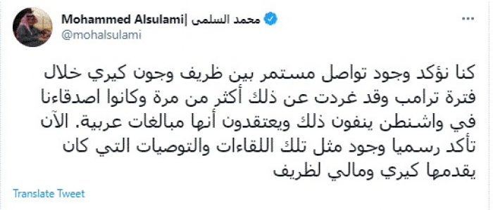 وقال في تغريدة عبر "تويتر" رصدها "المشهد العربي": "كنا نؤكد وجود تواصل مستمر بين ظريف وجون كيري خلال فترة ترامب وقد غردت عن ذلك أكثر من مرة وكانوا اصدقاءنا في واشنطن ينفون ذلك ويعتقدون أنها مبالغات عربية".