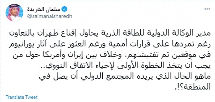 وقال في تغريدة عبر "تويتر" رصدها "المشهد العربي": "مدير الوكالة الدولية للطاقة الذرية يحاول إقناع طهران بالتعاون رغم تمردها على قرارات أممية ورغم العثور على آثار يورانيوم في موقعين تم تفتيشهم، وخلاف بين إيران وأمريكا حول من يجب أن يتخذ الخطوة الأولى لإحياء الاتفاق النووي".