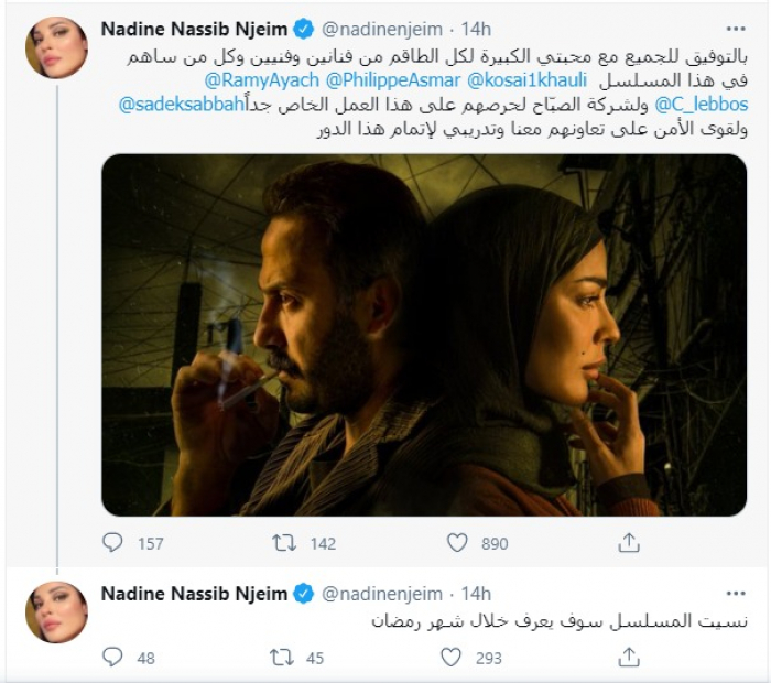 ونشرت نادين بوستر المسلسل، عبر حسابها الرسمي بموقع "تويتر"، وعلقت: "بالتوفيق للجميع مع محبتي الكبيرة لكل الطاقم من فنانين وفنيين وكل من ساهم في هذا المسلسل".