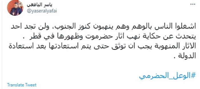 وقال في تغريدة عبر "تويتر" رصدها "المشهد العربي": "أشغلوا الناس بالوهم وهم ينهبون كنوز الجنوب، ولن تجد أحد يتحدث عن حكاية نهب آثار حضرموت وظهورها في قطر".