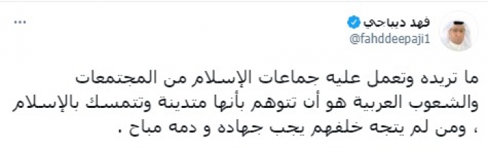 وقال في تغريدة على حسابه بموقع التدوين المصغر تويتر، اليوم إلى أن: "ما تريده وتعمل عليه جماعات الإسلام من المجتمعات والشعوب العربية هو أن تتوهم بأنها متدينة وتتمسك بالإسلام".
