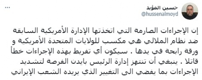 حذر الناشط السياسي حسين المؤيد من تنازل واشنطن عن العقوبات الصارمة التي فرضتها الإدارة الأمريكية السابقة تجاه نظام ملالي طهران، مؤكدا أنه خطأ فادح.