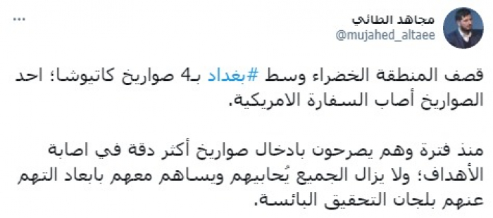 وأشار في تغريدة على حسابه بموقع التدوين المصغر تويتر، اليوم إلى أن: "قصف المنطقة الخضراء وسط بغداد بـ 4 صواريخ كاتيوشا؛ أحد الصواريخ أصاب السفارة الأمريكية".