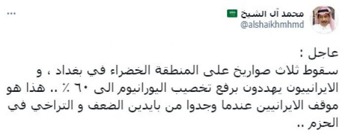 وأكد في تغريدة على حسابه بموقع التدوين المصغر تويتر، اليوم: "سقوط ثلاثة صواريخ على المنطقة الخضراء في بغداد، والإيرانييون يهددون برفع تخصيب اليورانيوم إلى ٦٠ ٪".