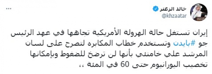 وشدد في تغريدة على حسابه بموقع التدوين المصغر تويتر، اليوم على أن: "إيران تستغل حالة الهرولة الأمريكية تجاهها في عهد الرئيس جو بايدن وتستخدم خطاب المكابرة".