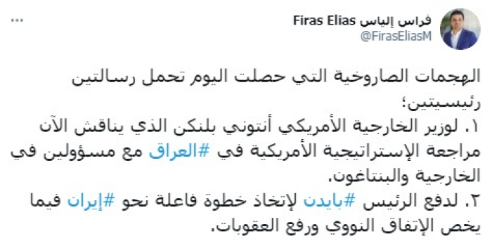 وأشار في تغريدة على حسابه بموقع التدوين المصغر تويتر، اليوم إلى أن: "الهجمات الصاروخية التي حصلت اليوم تحمل رسالتين رئيسيتين".
