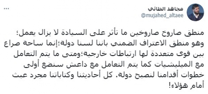 وشدد في تغريدة على حسابه بموقع التدوين المصغر تويتر، اليوم على أن: "منطق صاروخ صاروخين ما تأثر على السيادة لا يزال يعمل؛ وهو منطق الاعتراف الضمني بأننا لسنا دولة".