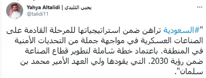 وكتب في تغريدة عبر "تويتر" رصدها "المشهد العربي": "السعودية تراهن ضمن استراتيجياتها للمرحلة القادمة على الصناعات العسكرية في مواجهة جملة من التحديات الأمنية في المنطقة، باعتماد خطة شاملة لتطوير قطاع الصناعة ضمن رؤية 2030، التي يقودها ولي العهد الأمير محمد بن سلمان".