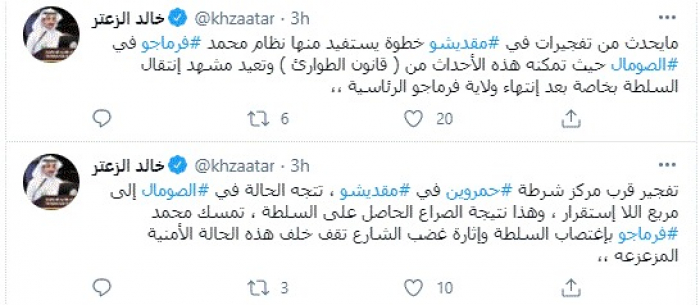 وكتب في تغريدات عبر "تويتر" رصدها "المشهد العربي": "تفجير قرب مركز شرطة حمروين في مقديشو ، تتجه الحالة في الصومال إلى مربع اللا إستقرار ، وهذا نتيجة الصراع الحاصل على السلطة ، تمسك محمد فرماجو بإغتصاب السلطة وإثارة غضب الشارع تقف خلف هذه الحالة الأمنية المزعزعة".