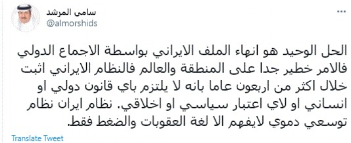 وقال في تغريدة عبر "تويتر" رصدها "المشهد العربي": "الحل الوحيد هو انهاء الملف الإيراني بواسطة الإجماع الدولي فالأمر خطير جدا على المنطقة والعالم فالنظام الإيراني أثبت خلال أكثر من أربعون عاما بأنه لا يلتزم باي قانون دولي أو إنساني أو لأي اعتبار سياسي أو أخلاقي".