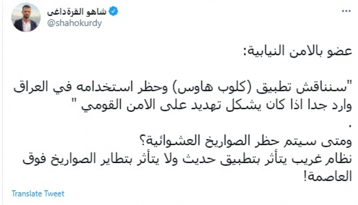 وقال في تغريدة عبر "تويتر" رصدها "المشهد العربي": "عضو بالأمن النيابية: سنناقش تطبيق (كلوب هاوس) وحظر استخدامه في العراق وارد جدا اذا كان يشكل تهديد على الأمن القومي ومتى سيتم حظر الصواريخ العشوائية؟ نظام غريب يتأثر بتطبيق حديث ولا يتأثر بتطاير الصواريخ فوق العاصمة".
