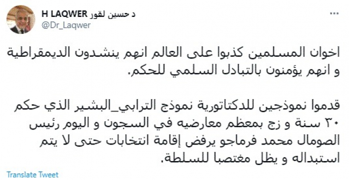 وأضاف: "قدموا نموذجين للدكتاتورية نموذج الترابي البشير الذي حكم ٣٠ سنة و زج بمعظم معارضيه في السجون واليوم رئيس الصومال محمد فرماجو يرفض إقامة انتخابات حتى لا يتم استبداله ويظل مغتصبا للسلطة".