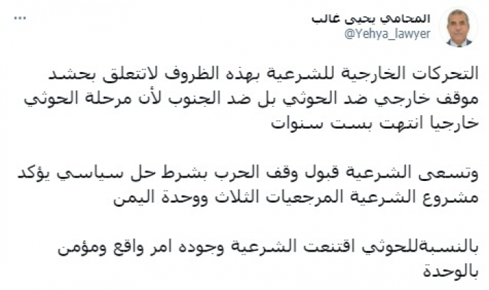 وأكد في تغريدة على حسابه بموقع التدوين المصغر تويتر، اليوم أن: "التحركات الخارجية للشرعية بهذه الظروف لا تتعلق بحشد موقف خارجي ضد الحوثي".