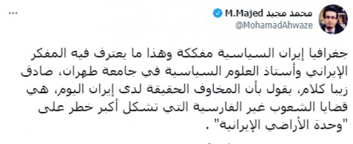 أكد الباحث السياسي محمد مجيد الأحوازي أن الجغرافيا السياسية الإيرانية مفككة، مشيرا إلى أن أكاديميين إيران يعتبرون القوميات غير الفارسية خطرا على نظام ملالي طهران.