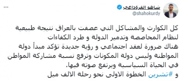 وأشار في تغريدة على حسابه بموقع التدوين المصغر تويتر، اليوم إلى أنه: " كل الكوارث والمشاكل التي عصفت بالعراق نتيجة طبيعية لنظام المحاصصة وتدمير الدولة و طرد الكفاءات".
