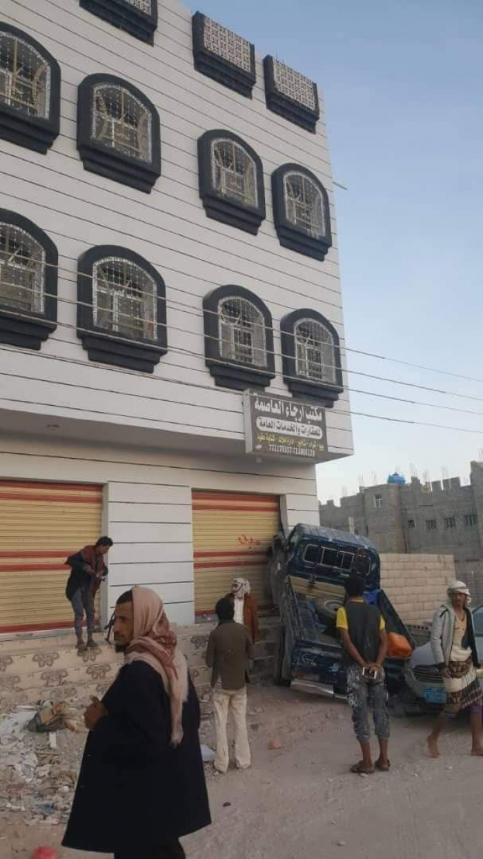 وقال شهود عيان، إن الطقم العسكري اصطدم بمكتب "أرجاء العاصمة للعقارات" في شارع الثلاثين.