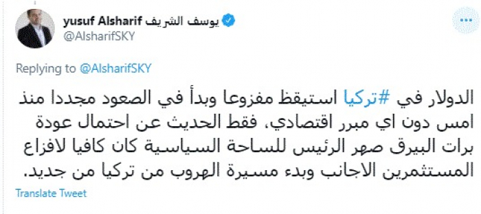 وقال في تغريدة عبر "تويتر" رصدها "المشهد العربي": "الدولار في تركيا استيقظ مفزوعا وبدأ في الصعود مجددا منذ أمس دون أي مبرر اقتصادي، فقط الحديث عن احتمال عودة برات البيرق صهر الرئيس للساحة السياسية كان كافيا لإفزاع المستثمرين الأجانب وبدء مسيرة الهروب من تركيا من جديد".
