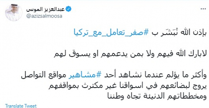 وقال في تغريدة عبر "تويتر" رصدها "المشهد العربي": "بإذن الله نُبَشَر بصفر تعامل مع تركيا.. لا بارك الله فيهم ولا بمن يدعمهم أو يسوق لهم وأكثر ما يؤلم عندما نشاهد أحد مشاهير مواقع التواصل يروج لبضائعهم في أسواقنا غير مكترث بمواقفهم ومخططاتهم الدنيئة تجاه وطننا".