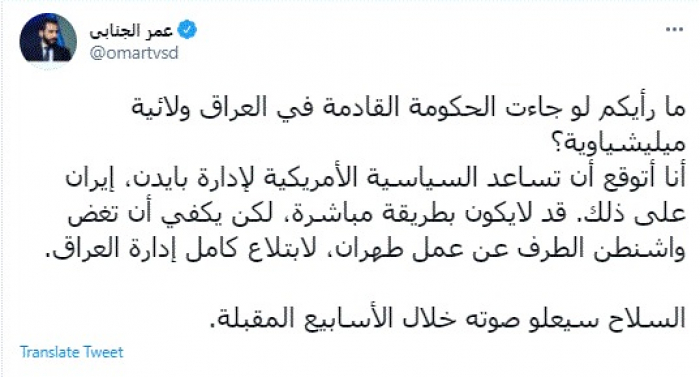 وقال في تغريدة عبر "تويتر" رصدها "المشهد العربي": "ما رأيكم لو جاءت الحكومة القادمة في العراق ولائية مليشياوية؟ أنا أتوقع أن تساعد السياسية الأمريكية لإدارة بايدن، إيران على ذلك. قد لايكون بطريقة مباشرة، لكن يكفي أن تغض واشنطن الطرف عن عمل طهران، لابتلاع كامل إدارة العراق".