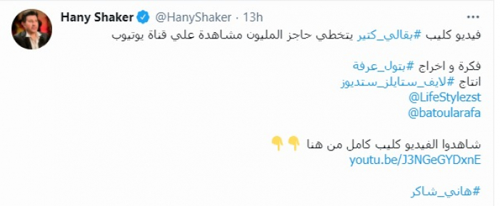 وغرد "شاكر"، حول الفيديو كليب الخاص به عبر حسابه بموقع "تويتر"، قائلًا: "فيديو كليب بقالي كتير يتخطى حاجز المليون مشاهدة على قناة يوتيوب".