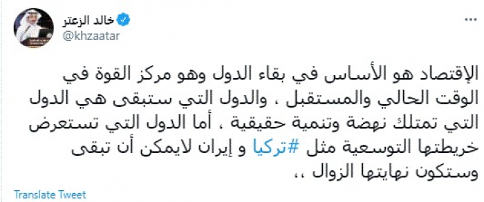 وكتب في تغريدة عبر "تويتر" رصدها "المشهد العربي": "الإقتصاد هو الأساس في بقاء الدول وهو مركز القوة في الوقت الحالي والمستقبل ، والدول التي ستبقى هي الدول التي تمتلك نهضة وتنمية حقيقية ، أما الدول التي تستعرض خريطتها التوسعية مثل تركيا وإيران لايمكن أن تبقى وستكون نهايتها الزوال".