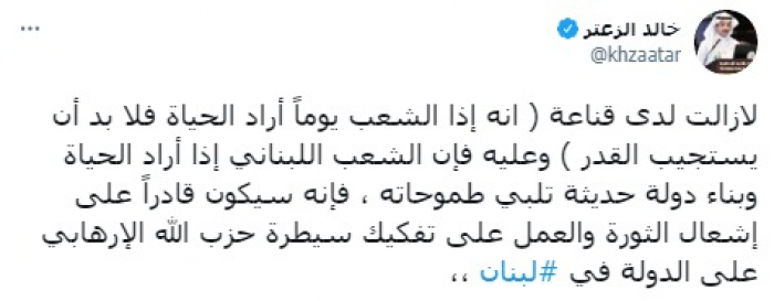 رأى المحلل السياسي السعودي خالد الزعتر أن الشعب اللبناني قادر على إنهاء سيطرة مليشيات حزب الله على مفاصل الدولة، تمهيدا لبناء دولة حديثة.