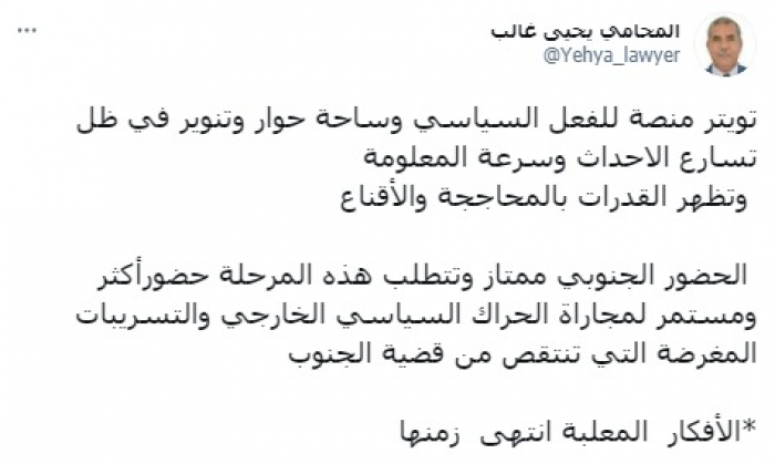 شدد الناشط السياسي يحيى غالب على نجاح الحضور الجنوبي على مواقع التواصل الاجتماعي، في التصدي للحراك المغرض المعادي للجنوب.