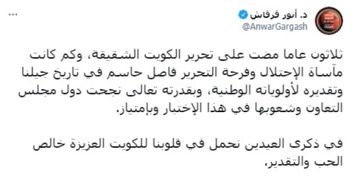 اعتبر المستشار الدبلوماسي لرئيس دولة الإمارات، الدكتور أنور قرقاش، أن تحرير الكويت لحظة حاسمة في تقدير الأولويات الوطنية لدول مجلس التعاون الخليجي.