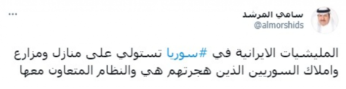 وأشار في تغريدة على حسابه بموقع التدوين المصغر تويتر، اليوم إلى أن: "المليشيات الإيرانية في سوريا تستولي على منازل ومزارع وأملاك السوريين الذين هجرتهم هي والنظام المتعاون معها".