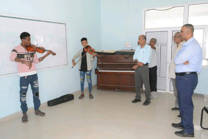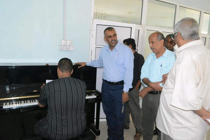واستمع من مسؤولي المعهد إلى شرح بالصعوبات والعراقيل التي تواجه سير الدراسة، والمتطلبات اللازمة لإعادة تأهيل قاعة المعهد وتزويده بالمعدات الموسيقية.