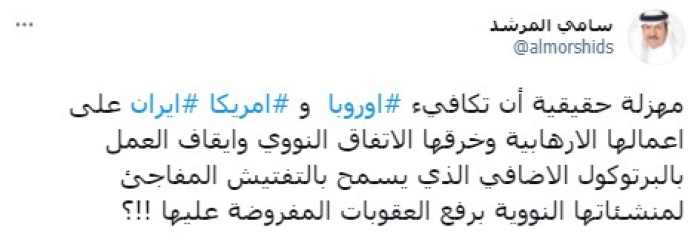 وقال في تغريدة على حسابه بموقع التدوين المصغر تويتر، اليوم إنها: "مهزلة حقيقية أن تكافيء أوروبا وأمريكا إيران، على أعمالها الإرهابية".
