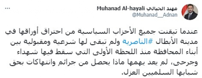 وأكد في تغريدة على حسابه بموقع التدوين المصغر تويتر، اليوم أنه: "عندما تيقنت جميع الأحزاب السياسية من احتراق أوراقها في مدينة الأبطال الناصرية، ولم تبقى لها شرعية ومقبولية بين أبناء المحافظة منذ اللحظة الأولى التي سقط فيها شهداء وجرحى، لم يعد يهمها ماذا يحصل من جرائم وانتهاكات بحق شبابها السلميين العزل".
