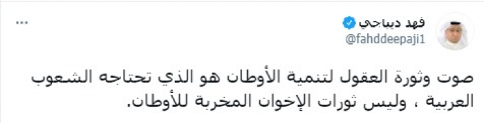 وقال في تغريدة على حسابه بموقع التدوين المصغر تويتر، اليوم إن: "صوت وثورة العقول لتنمية الأوطان هو الذي تحتاجه الشعوب العربية، وليس ثورات الإخوان المخربة للأوطان".