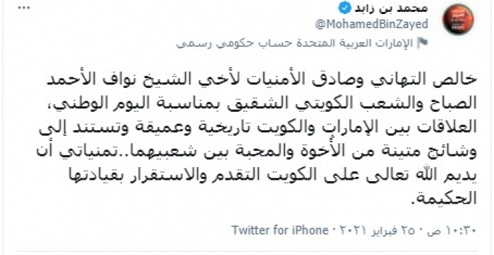 وكتب "بن زابد" تغريدة عبر تويتر، رصدها "المشهد العربي": "خالص التهاني وصادق الأمنيات لأخي الشيخ نواف الأحمد الصباح والشعب الكويتي الشقيق بمناسبة اليوم الوطني، العلاقات بين الإمارات والكويت تاريخية وعميقة وتستند إلى وشائج متينة من الأُخوة والمحبة بين شعبيهما..تمنياتي أن يديم الله تعالى على الكويت التقدم والاستقرار بقيادتها الحكيمة".