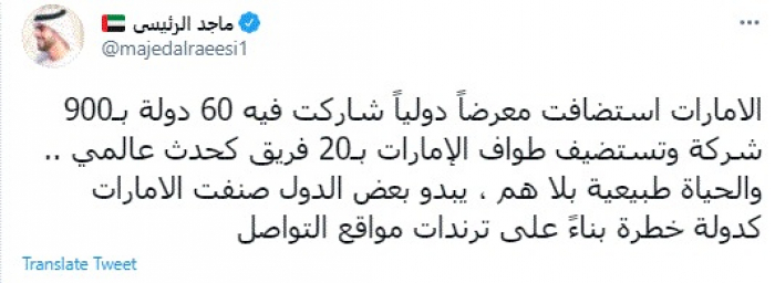 وقال في تغريدة عبر "تويتر" رصدها "المشهد العربي": "الإمارات استضافت معرضاً دولياً شاركت فيه 60 دولة بـ900 شركة وتستضيف طواف الإمارات بـ20 فريق كحدث عالمي .. والحياة طبيعية بلا هم ، يبدو بعض الدول صنفت الإمارات كدولة خطرة بناءً على ترندات مواقع التواصل".