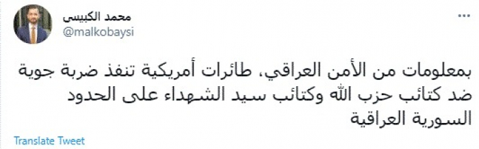 وقال في تغريدة عبر "تويتر" رصدها "المشهد العربي": "بمعلومات من الأمن العراقي، طائرات أمريكية تنفذ ضربة جوية ضد كتائب حزب الله وكتائب سيد الشهداء على الحدود السورية العراقية".