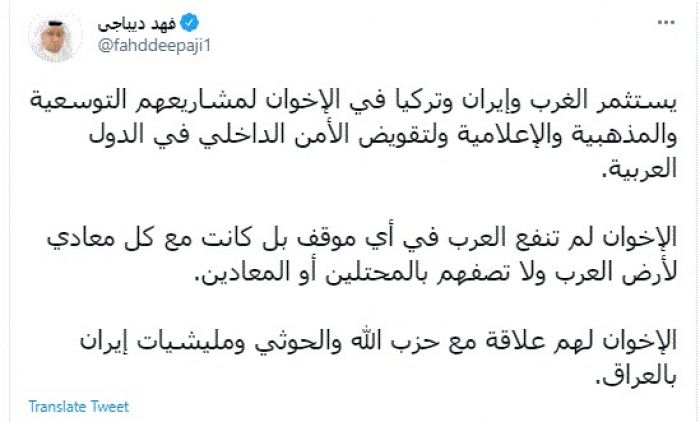 وقال في تغريدة عبر "تويتر" رصدها "المشهد العربي": "يستثمر الغرب وإيران وتركيا في الإخوان لمشاريعهم التوسعية والمذهبية والإعلامية ولتقويض الأمن الداخلي في الدول العربية".