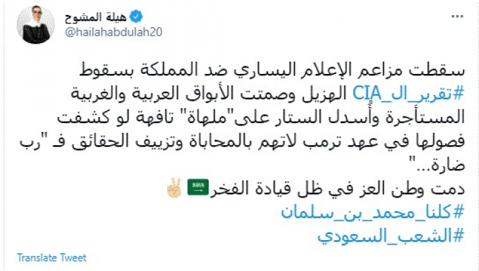 وقالت في تغريدة عبر "تويتر" رصدها "المشهد العربي": "سقطت مزاعم الإعلام اليساري ضد المملكة بسقوط تقرير ال CIA الهزيل وصمتت الأبواق العربية والغربية المستأجرة وأُسدل الستار على ملهاة تافهة لو كشفت فصولها في عهد ترمب لاتهم بالمحاباة وتزييف الحقائق فرب ضارة… دمت وطن العز في ظل قيادة الفخر.. كلنا محمد بن سلمان".