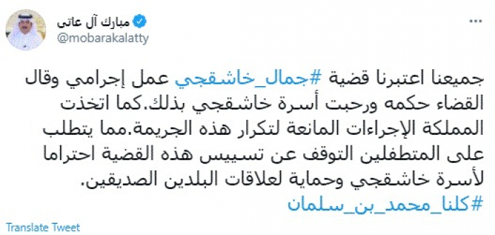 آل عاتي: الشعب السعودي يثق في قيادته.. ويجب وقف تسييس قضية خاشقجي
