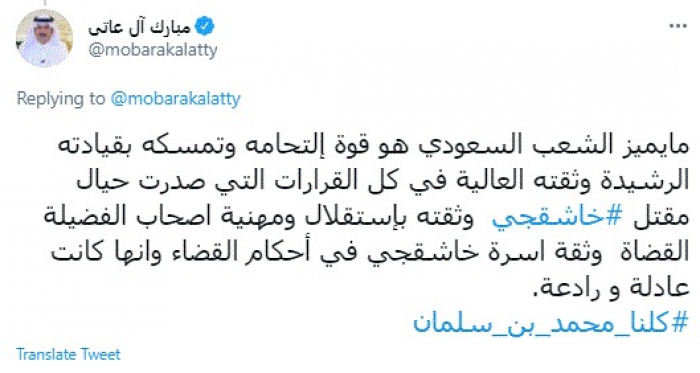 وأضاف في تغريدة أخرى: "ما يميز الشعب السعودي هو قوة إلتحامه وتمسكه بقيادته الرشيدة وثقته العالية في كل القرارات التي صدرت حيال مقتل خاشقجي وثقته بإستقلال ومهنية أصحاب الفضيلة القضاة وثقة أسرة خاشقجي في أحكام القضاء وأنها كانت عادلة ورادعة".