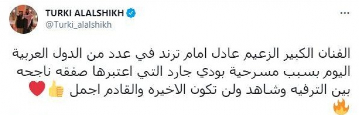 وكتب آل الشيخ، عبر حسابه بموقع "تويتر": "الفنان الكبير الزعيم عادل إمام تريند في عدد من الدول العربية اليوم بسبب مسرحية بودي جارد التي اعتبرها صفقة ناجحة بين (الترفيه) و(شاهد) ولن تكون الأخيرة والقادم أجمل".