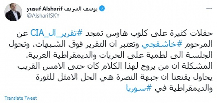 وكتب في تغريدة عبر "تويتر" رصدها "المشهد العربي": "حفلات كثيرة على كلوب هاوس تمجد تقرير ال CIA عن المرحوم خاشقجي وتعتبر أن التقرير فوق الشبهات، وتحول الجلسة إلى لطمية على الحريات والديمقراطية العربية".